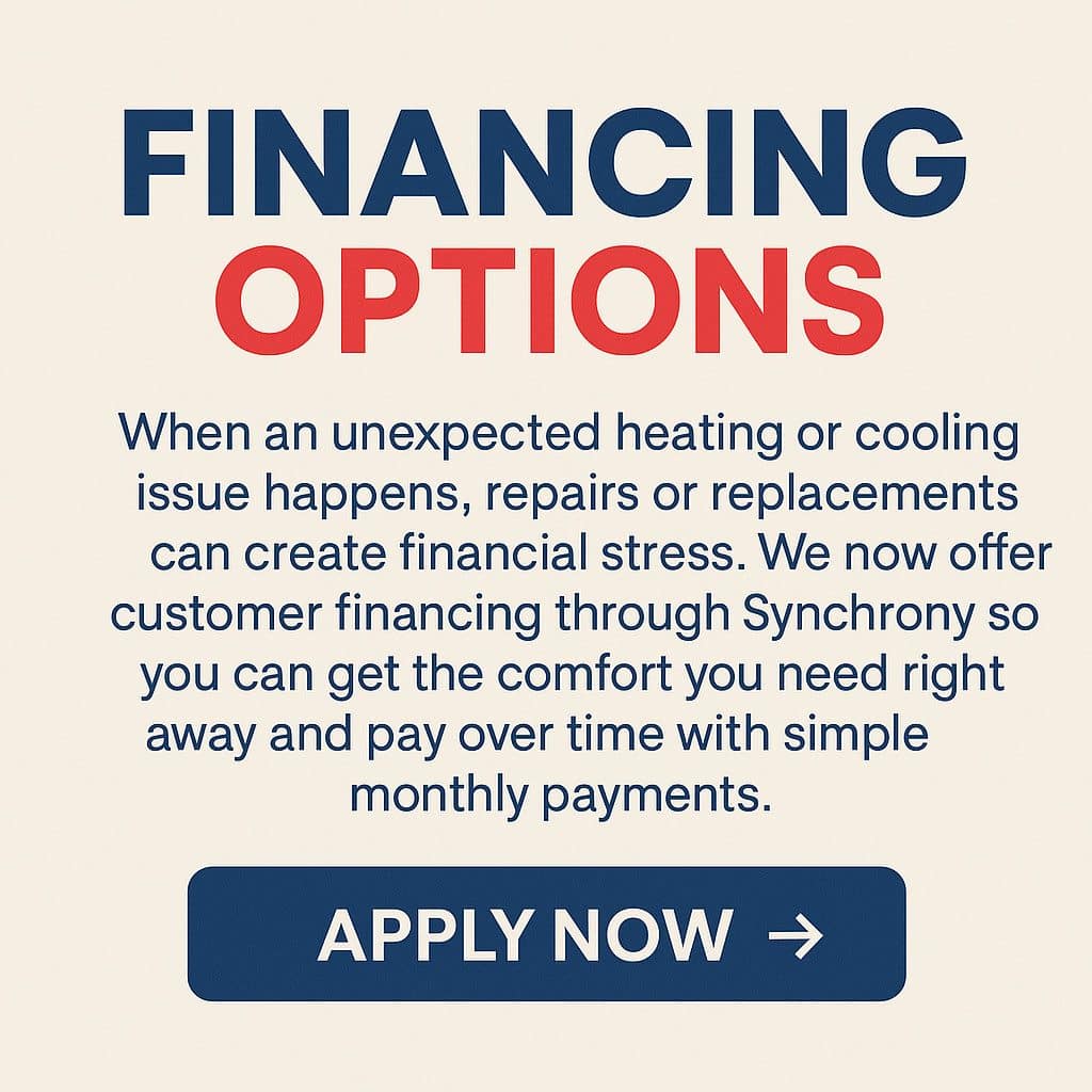When an unexpected heating or cooling issue happens, repairs or replacements can create financial stress. We now offer customer financing through Synchrony so you can get the comfort you need right away and pay over time with simple monthly payments.
